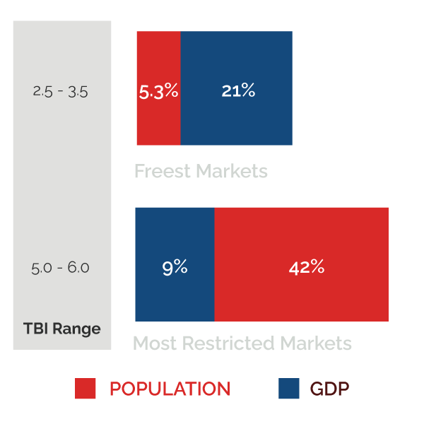 Only 5.35% of the world’s people live in the freest markets where they produce 21% of global GDP! The most restricted markets are home to 42% of world’s population, but the produce only 9% of global GDP.